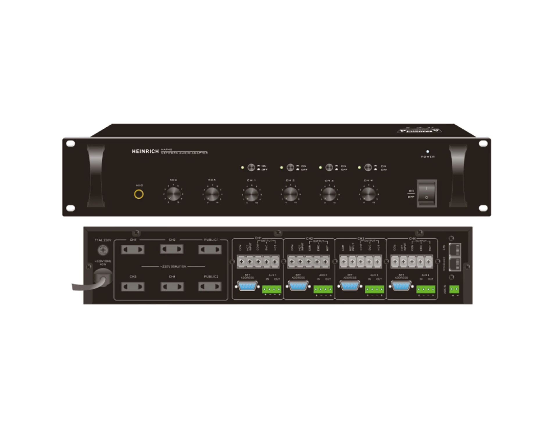 - 4 channel 100V speaker inputs loop and 4 channel 3 wired volume control.